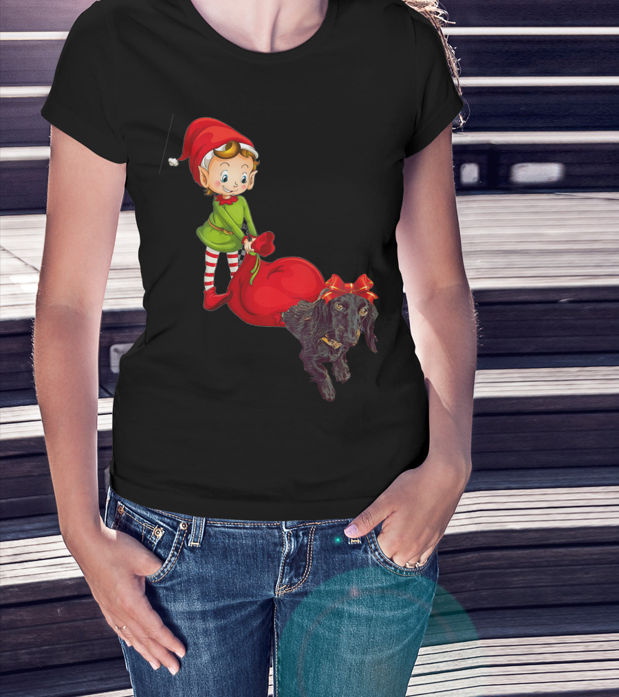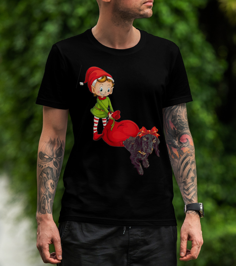 Kids Elf With Red Gift Sack And Black Dog In Santa Hat T-Shirt