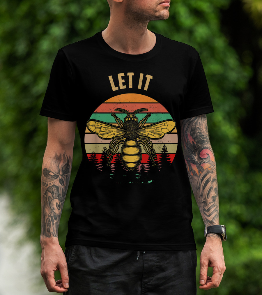 The Let It Bee Vintage Beekeeper Retro Forest Stripes T-shirt is designed for everyday wear and a consistent fit. Fabric is pre-shrunk ring-spun cotton with durable stitching. See the size chart below for exact measurements.