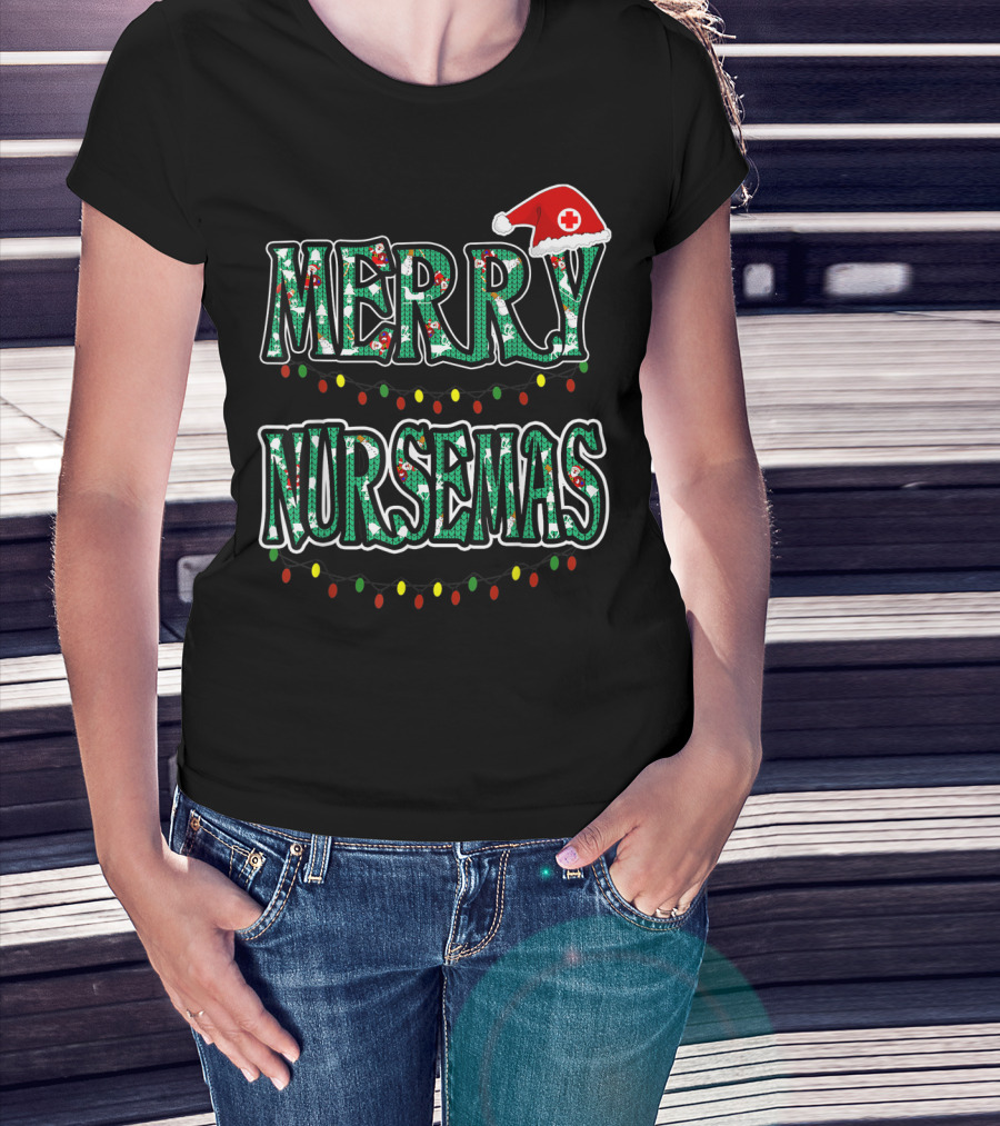 Merry Nursemas Christmas Santa Hat Lights T-Shirt