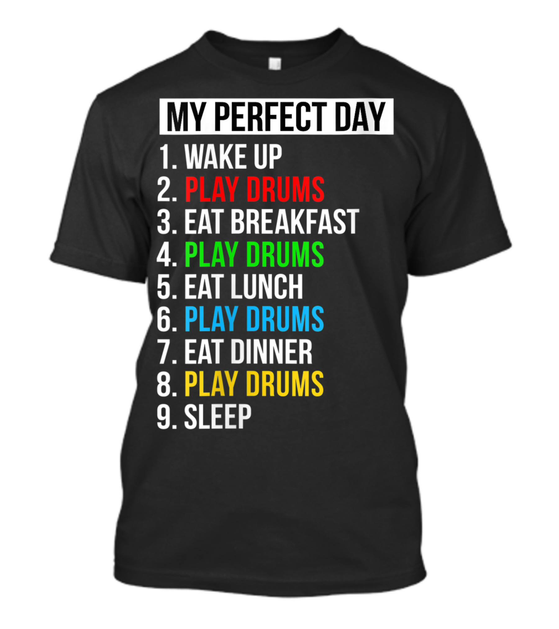 The My Perfect Day: Wake Up Play Drums Eat Breakfast Play Drums Eat Lunch Play Drums Eat Dinner Play Drums Sleep T-shirt is designed for everyday wear and a consistent fit. Fabric is pre-shrunk ring-spun cotton with durable stitching. See the size chart below for exact measurements.