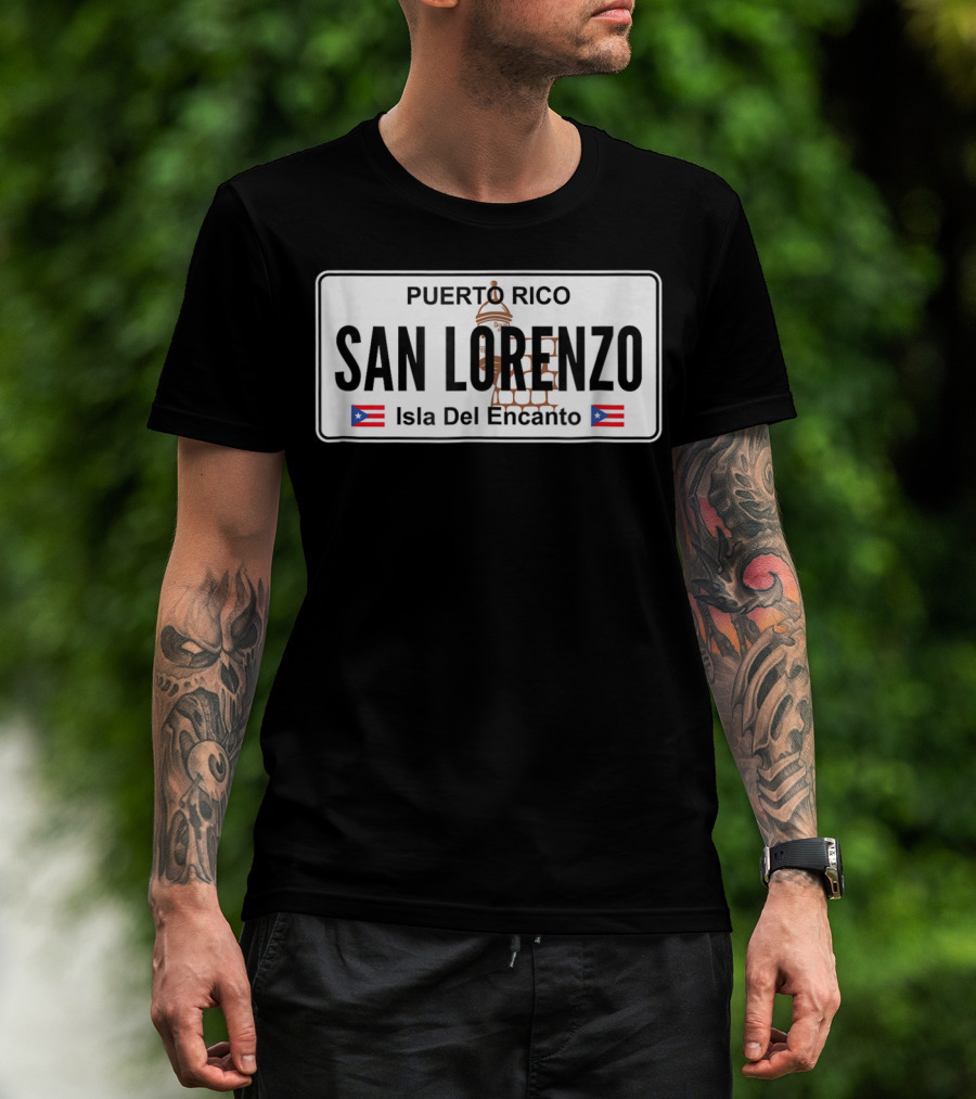 The San Lorenzo Puerto Rico Isla Del Encanto License Plate T-shirt is designed for everyday wear and a consistent fit. Fabric is pre-shrunk ring-spun cotton with durable stitching. See the size chart below for exact measurements.