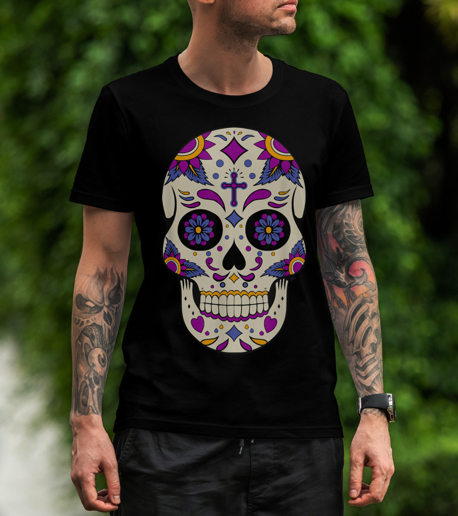 The Sugar Skull Day Of The Dead Halloween Dia De Los Muertos Colorful Cross Floral T-shirt is designed for everyday wear and a consistent fit. Fabric is pre-shrunk ring-spun cotton with durable stitching. See the size chart below for exact measurements.