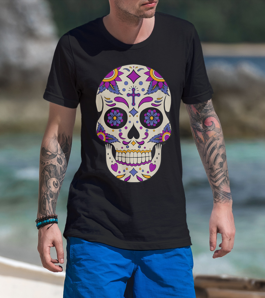 Sugar Skull Day Of The Dead Halloween Dia De Los Muertos Colorful Cross Floral T-Shirt