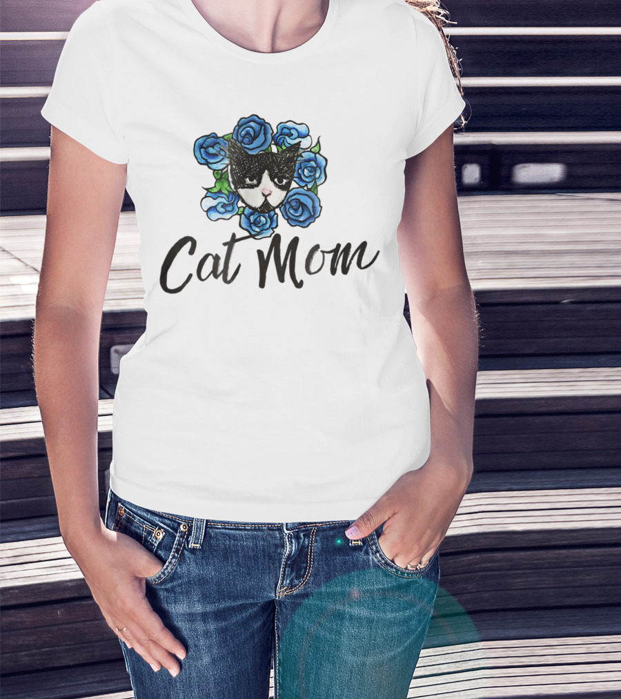 Cat Mom Floral Tuxedo Cat Blue Roses T-Shirt