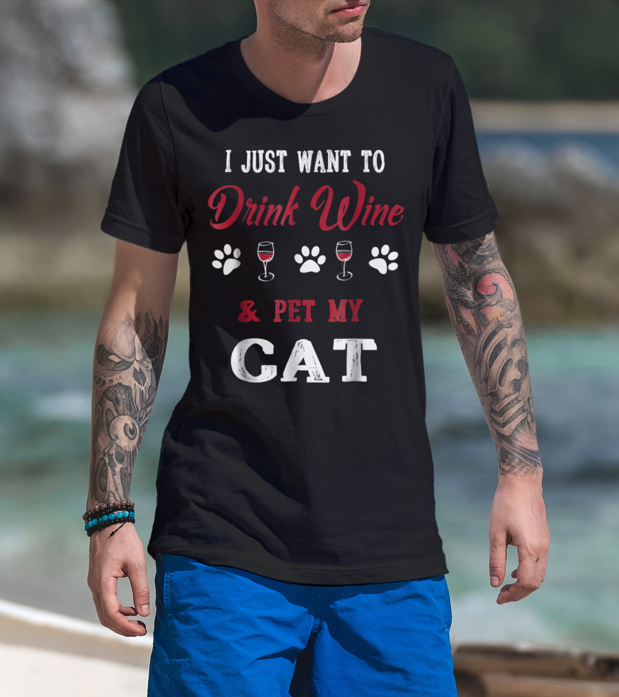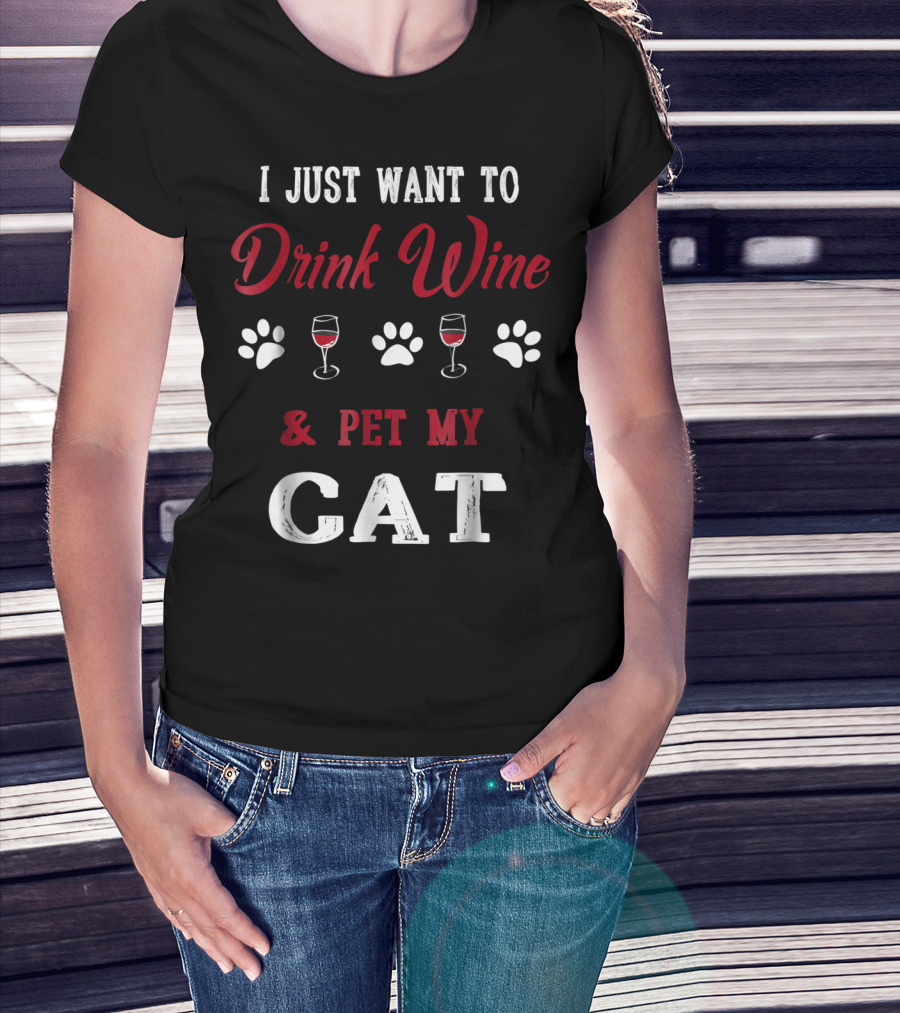 I Just Want To Drink Wine And Pet My Cat Paw Prints Wine Glasses T-Shirt