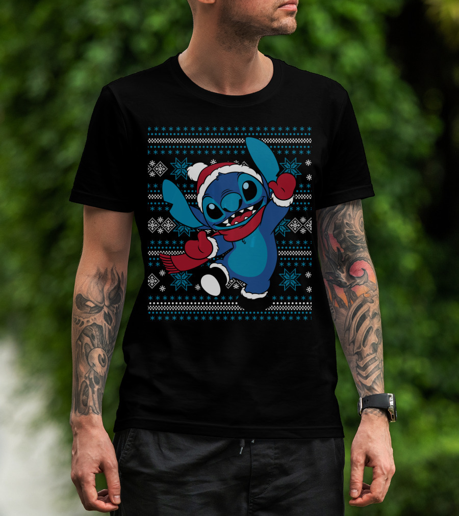 Disney Stitch Happy Holiday Festive Sweater Design With Snowflakes And Santa Hat T-Shirt