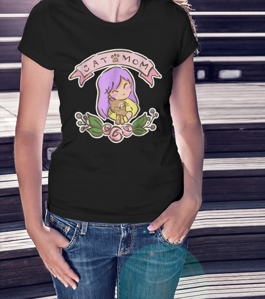 Cat Mom Cute Drawing With Purple Hair And Cat Hug T-Shirt