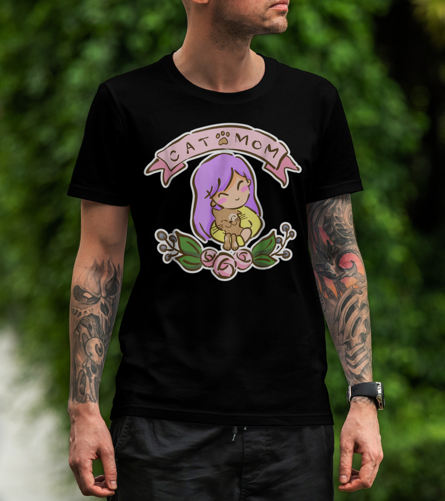 The Cat Mom Cute Drawing with Purple Hair and Cat Hug T-shirt is designed for everyday wear and a consistent fit. Fabric is pre-shrunk ring-spun cotton with durable stitching. See the size chart below for exact measurements.