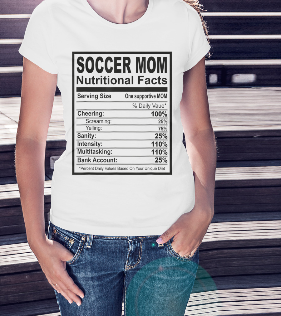 Soccer Mom Nutritional Facts Cheering Screaming Yelling Sanity Intensity Multitasking Bank Account T-Shirt