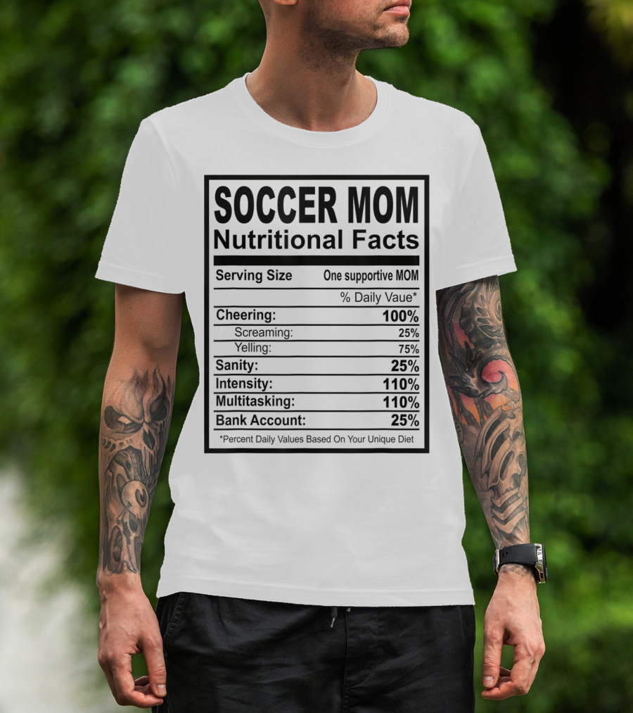 The Soccer Mom Nutritional Facts Cheering Screaming Yelling Sanity Intensity Multitasking Bank Account T-shirt is designed for everyday wear and a consistent fit. Fabric is pre-shrunk ring-spun cotton with durable stitching. See the size chart below for exact measurements.
