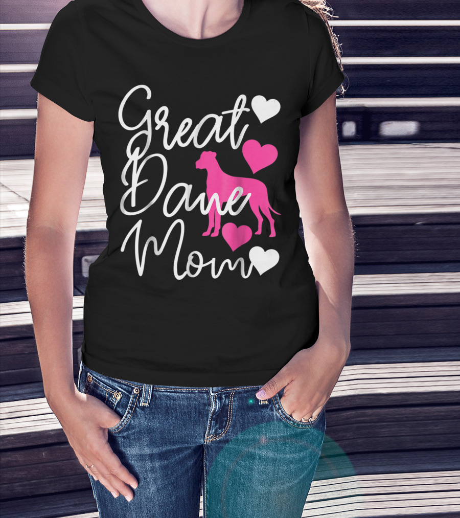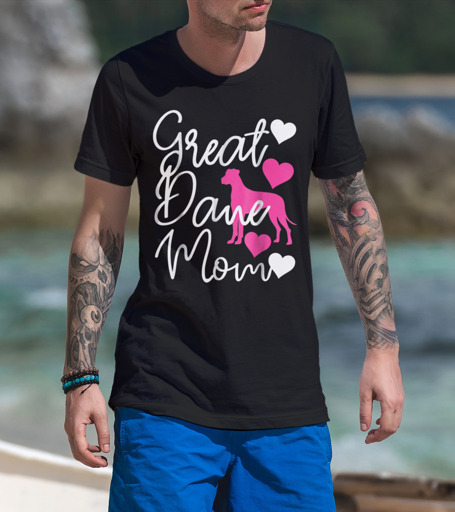 The Great Dane Mom with Pink Hearts T-shirt is designed for everyday wear and a consistent fit. Fabric is pre-shrunk ring-spun cotton with durable stitching. See the size chart below for exact measurements.