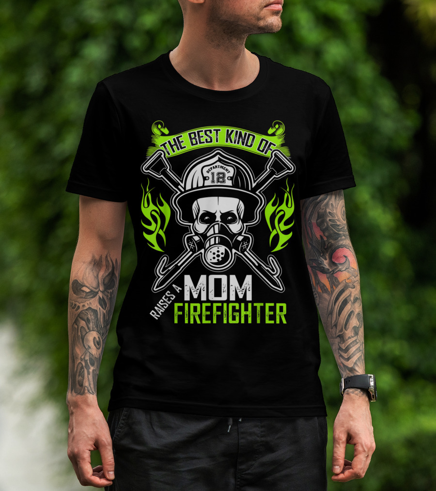 The Best Kind Of Mom Raises A Firefighter Skull Helmet Axes Flames T-Shirt