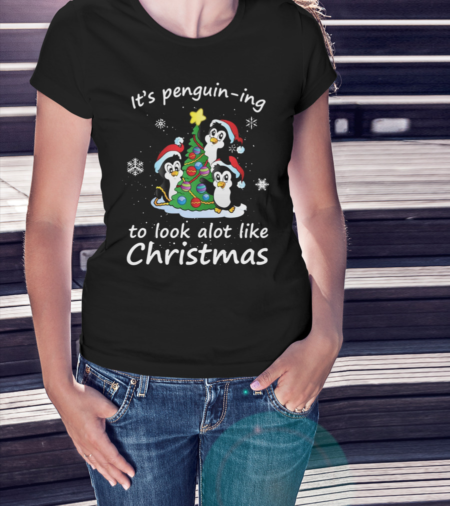 Penguin-ing To Look Alot Like Christmas Penguins Tree Santa Hats Snowflakes T-Shirt
