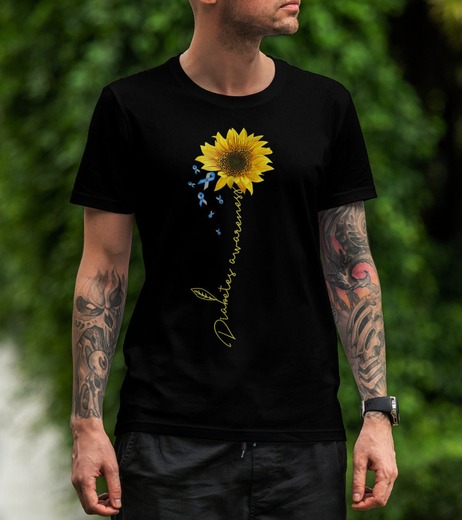 Diabetes Awareness Sunflower With Blue Ribbons T-Shirt