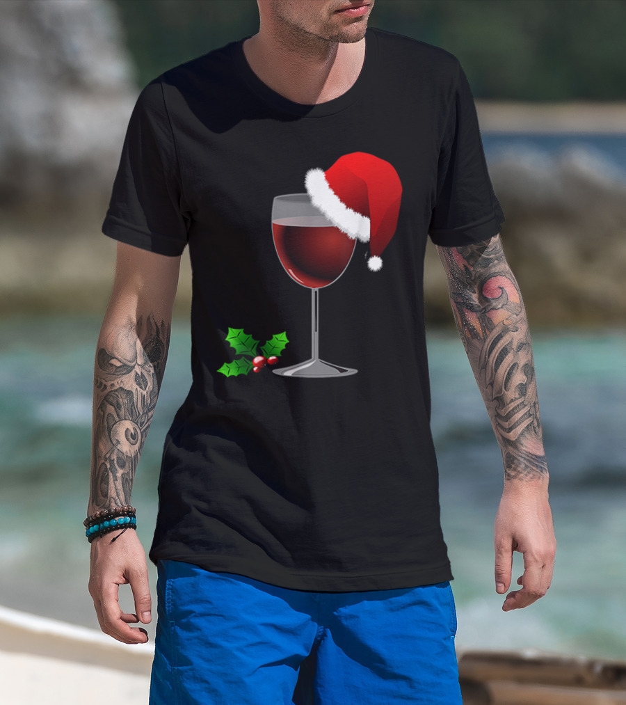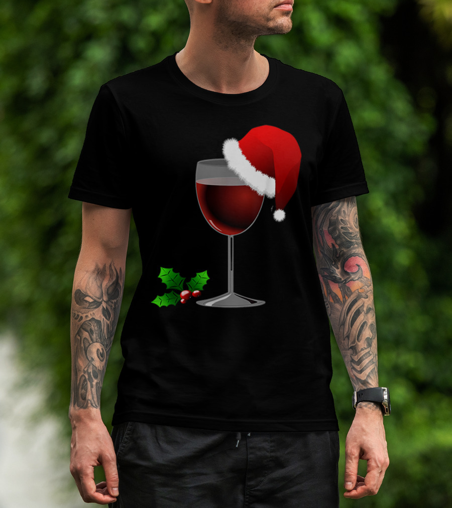 Wine Christmas Santa Hat Holly T-Shirt