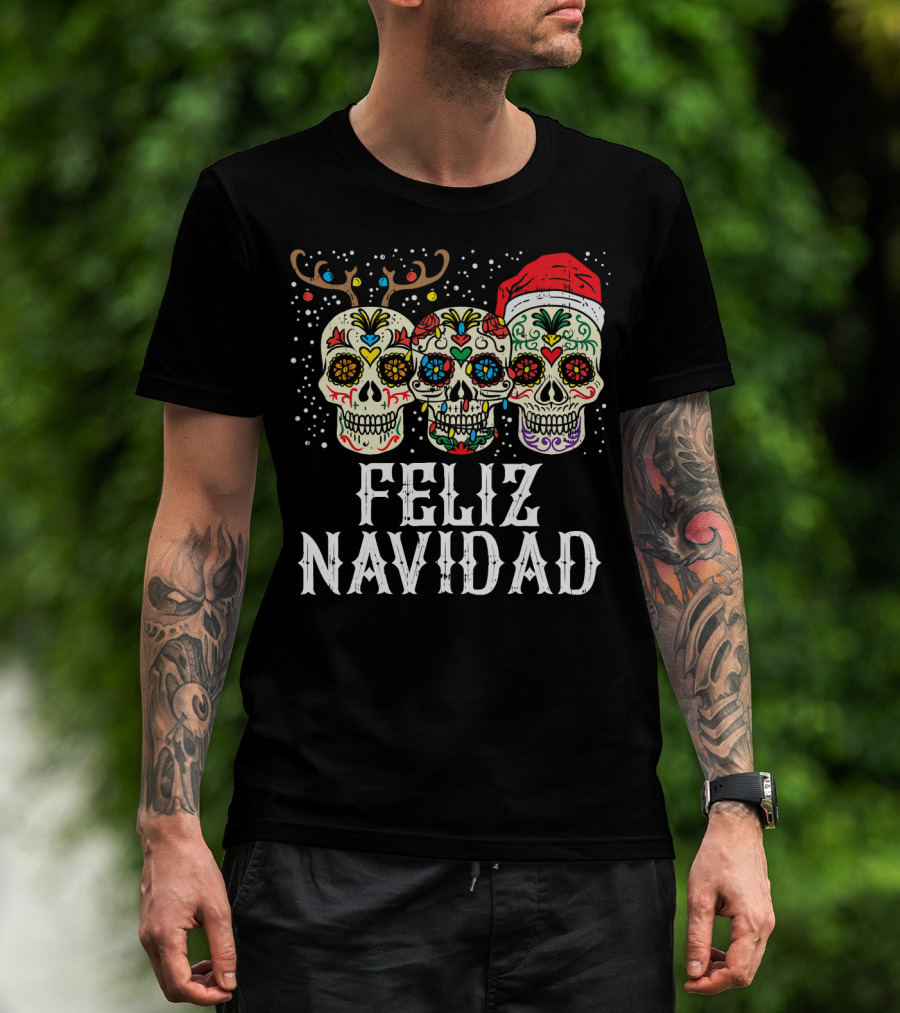 Feliz Navidad Sugar Skulls Reindeer Santa Fun Christmas Holiday Cheer T-Shirt