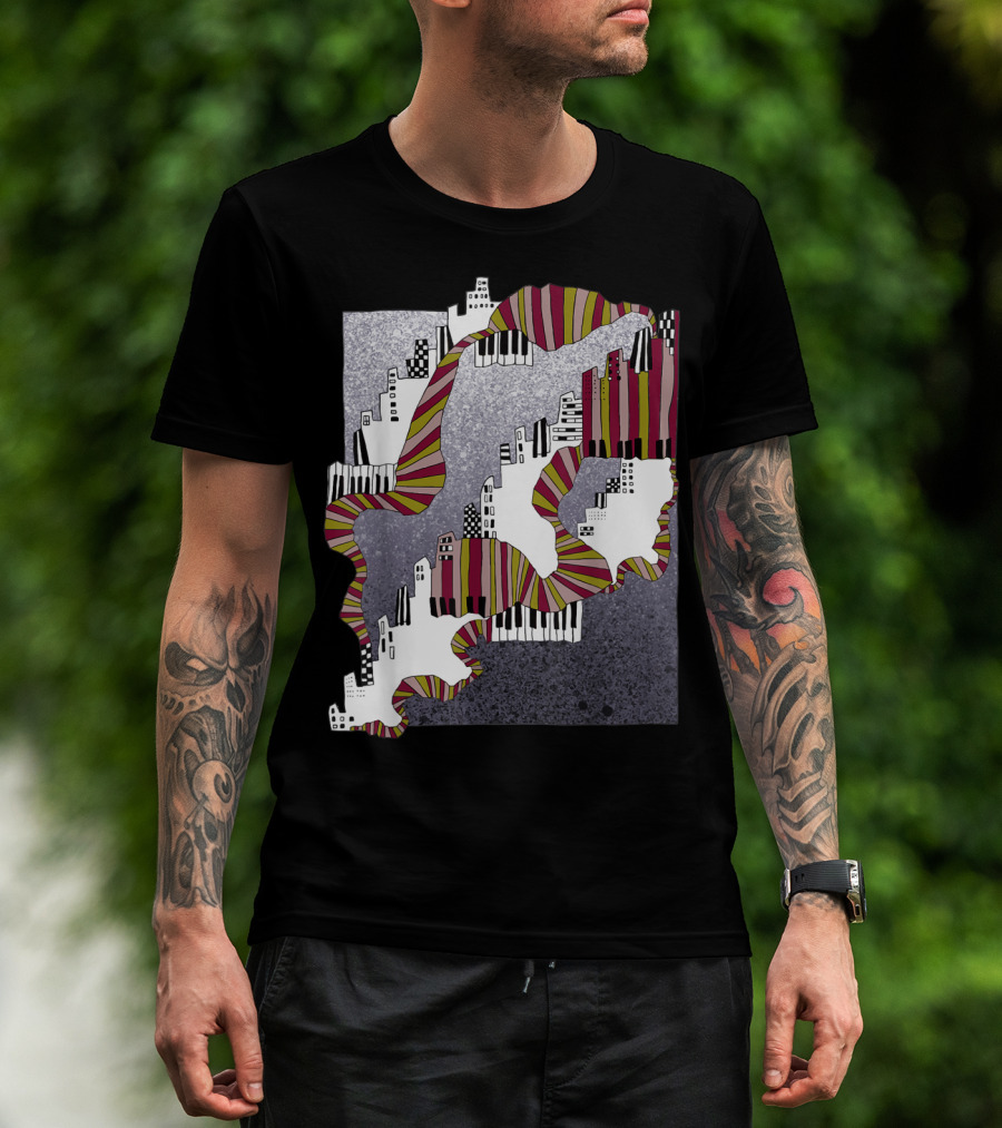 How much will this Mellow My Man Cityscape with 90s Hip Hop Piano Keys and Vibrant Stripes shirt shrink?