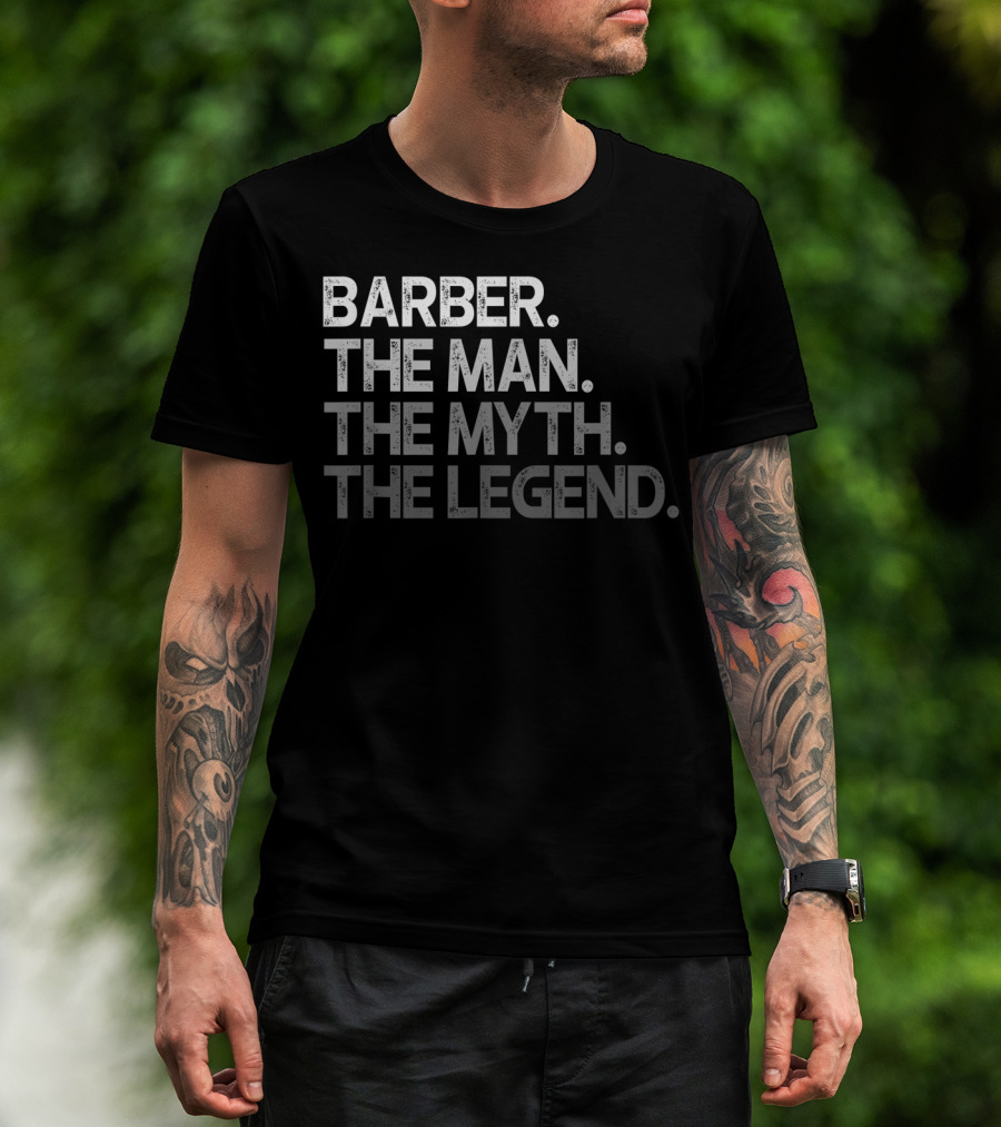The Barber The Man The Myth The Legend T-shirt is designed for everyday wear and a consistent fit. Fabric is pre-shrunk ring-spun cotton with durable stitching. See the size chart below for exact measurements.