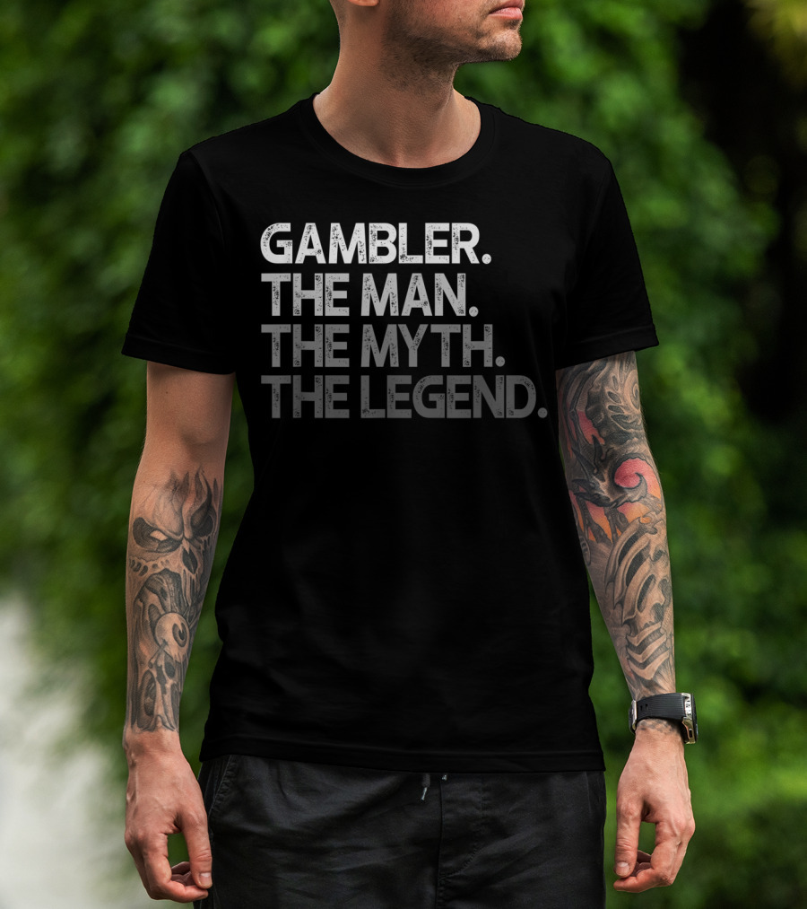 The Gambler The Man The Myth The Legend T-shirt is designed for everyday wear and a consistent fit. Fabric is pre-shrunk ring-spun cotton with durable stitching. See the size chart below for exact measurements.