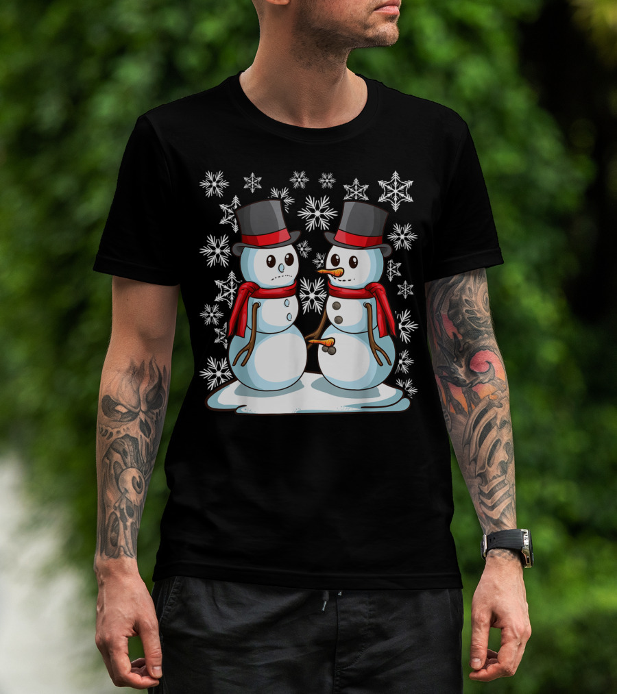 Naughty Christmas Snowmen With Carrot And Top Hats Amidst Snowflakes T-Shirt