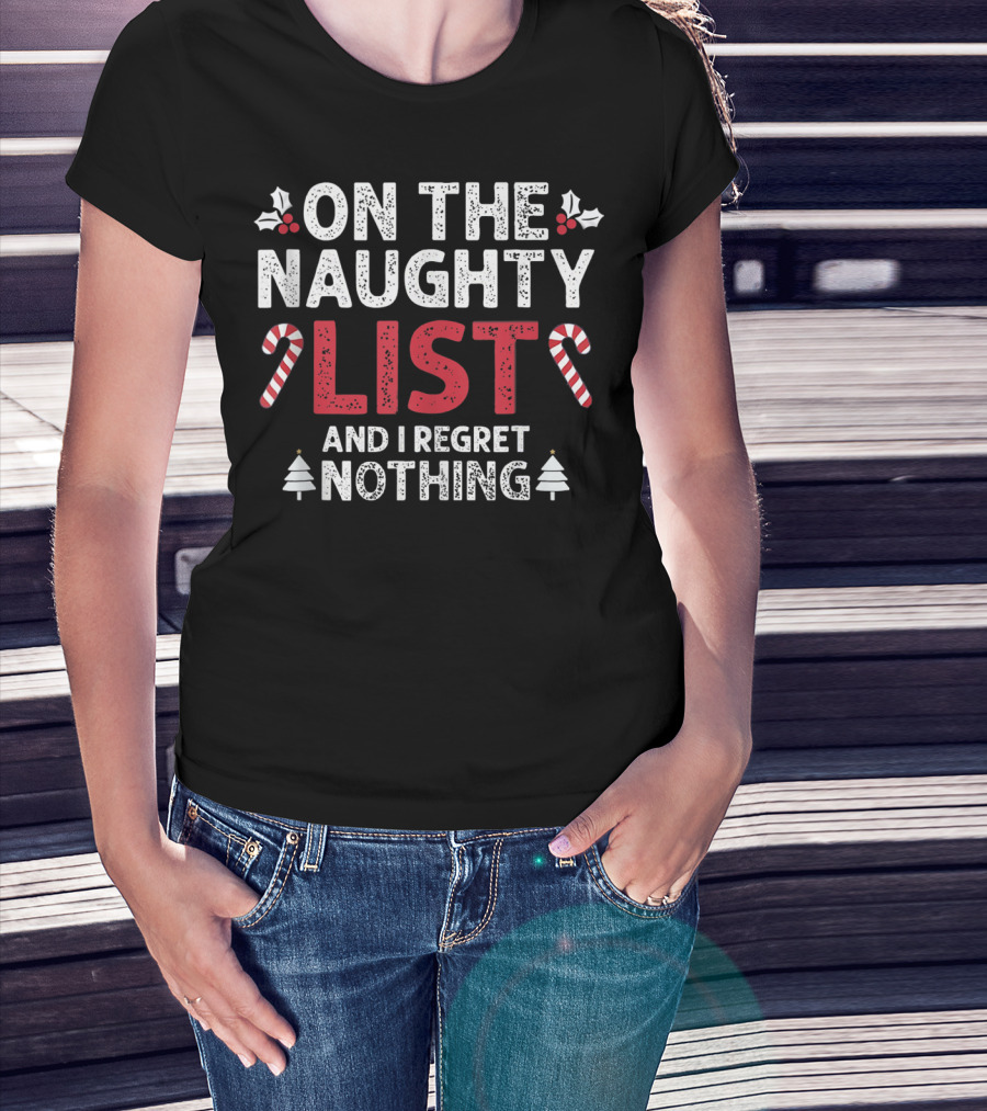 On The Naughty List And I Regret Nothing Candy Cane Holly Christmas Trees T-Shirt