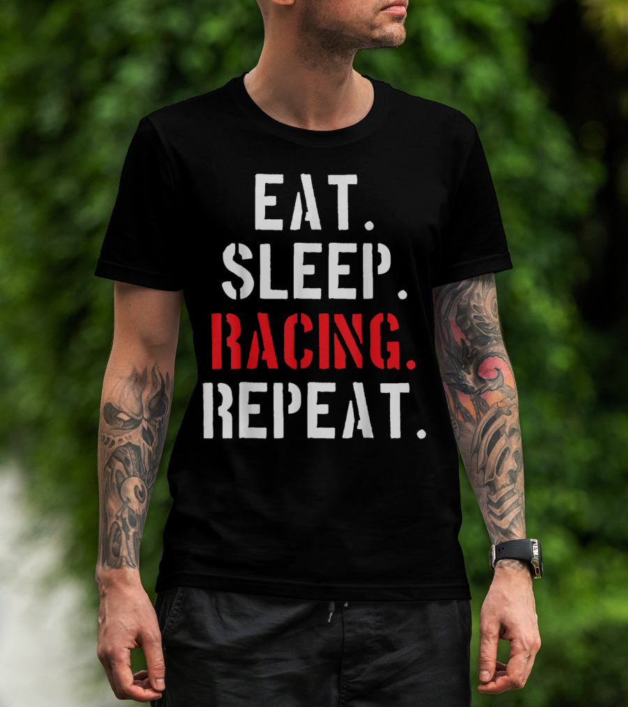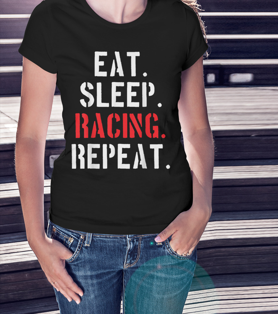The Eat Sleep Racing Repeat T-shirt is designed for everyday wear and a consistent fit. Fabric is pre-shrunk ring-spun cotton with durable stitching. See the size chart below for exact measurements.