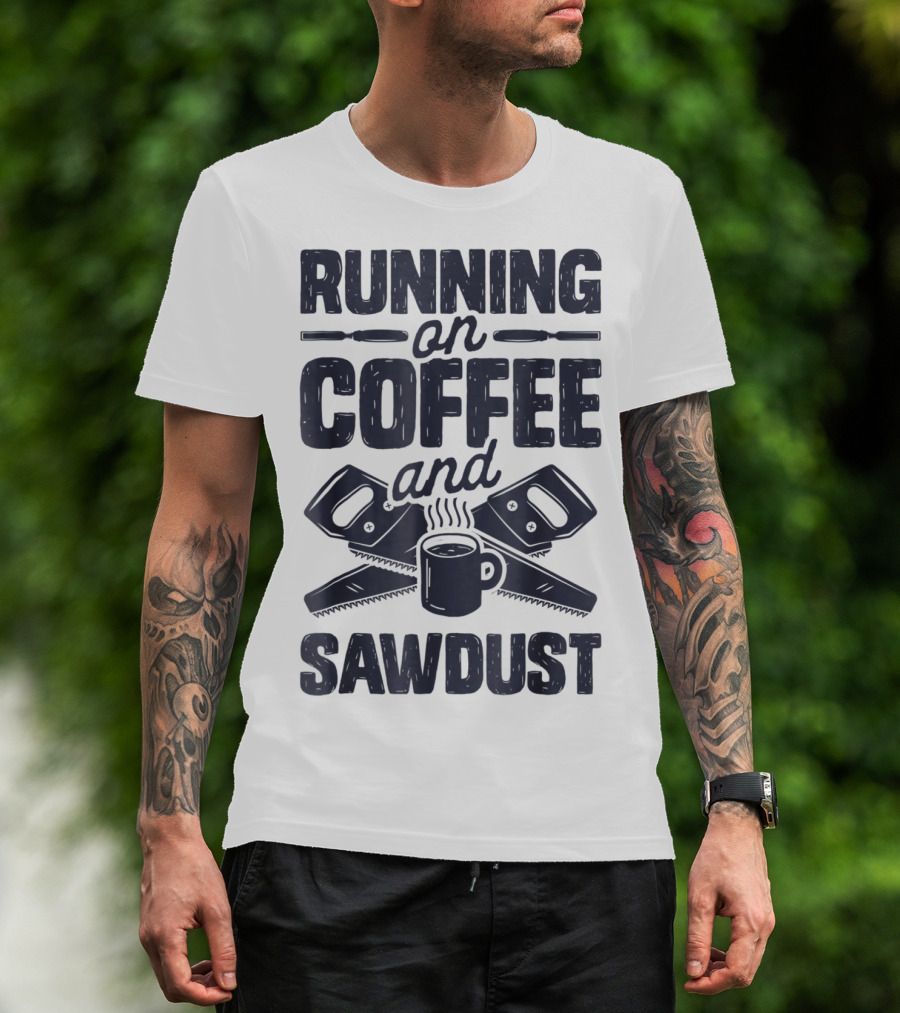 The Running On Coffee And Sawdust with Crossed Saws and Coffee Mug T-shirt is designed for everyday wear and a consistent fit. Fabric is pre-shrunk ring-spun cotton with durable stitching. See the size chart below for exact measurements.