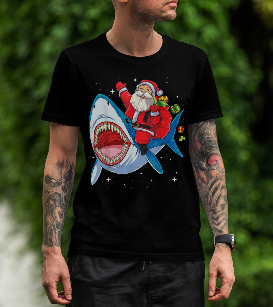 The Santa and Presents on Shark in Starry Christmas Galaxy T-shirt is designed for everyday wear and a consistent fit. Fabric is pre-shrunk ring-spun cotton with durable stitching. See the size chart below for exact measurements.