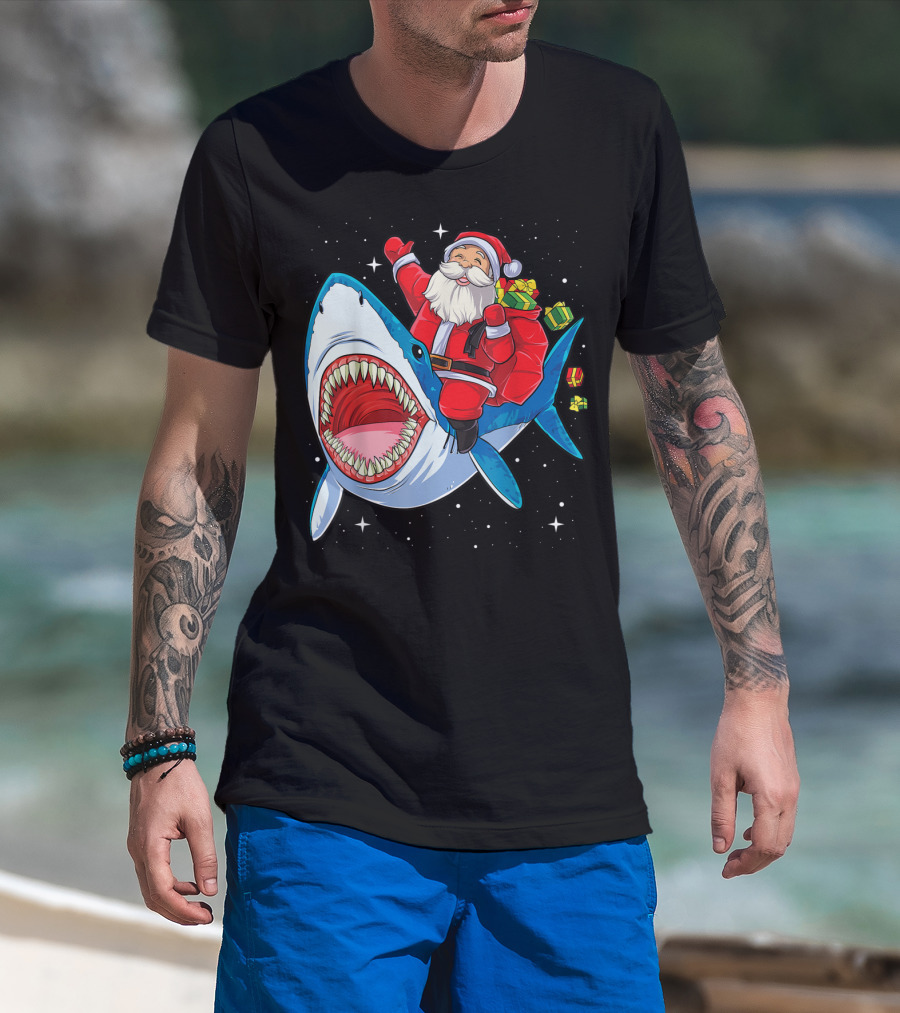 Santa And Presents On Shark In Starry Christmas Galaxy T-Shirt