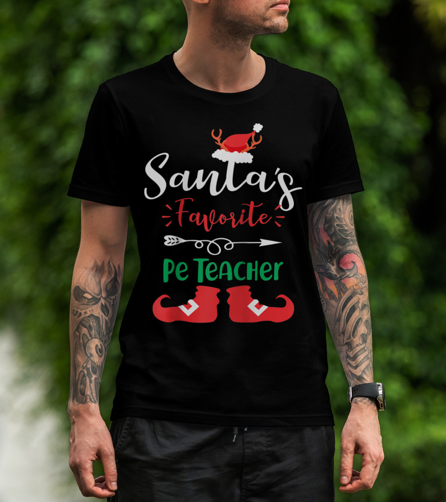Santa's Favorite PE Teacher Christmas Hat Antlers And Elf Shoes T-Shirt