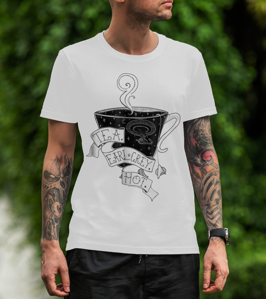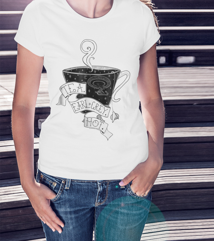The T.F.A. Earl Grey Hot Star Trek Next Generation Tea Cup T-shirt is designed for everyday wear and a consistent fit. Fabric is pre-shrunk ring-spun cotton with durable stitching. See the size chart below for exact measurements.