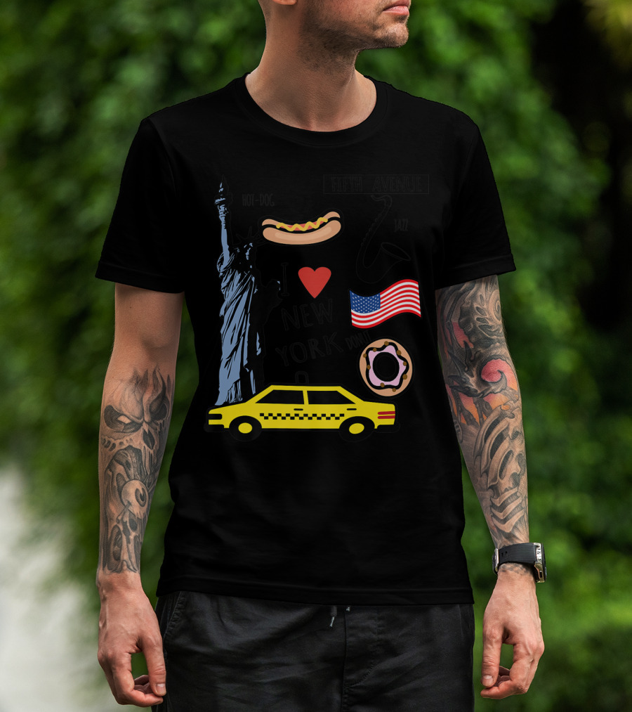 I Heart New York Top Spots Statue Of Liberty Taxi Fifth Avenue Hot Dog Jazz Donut American Flag T-Shirt