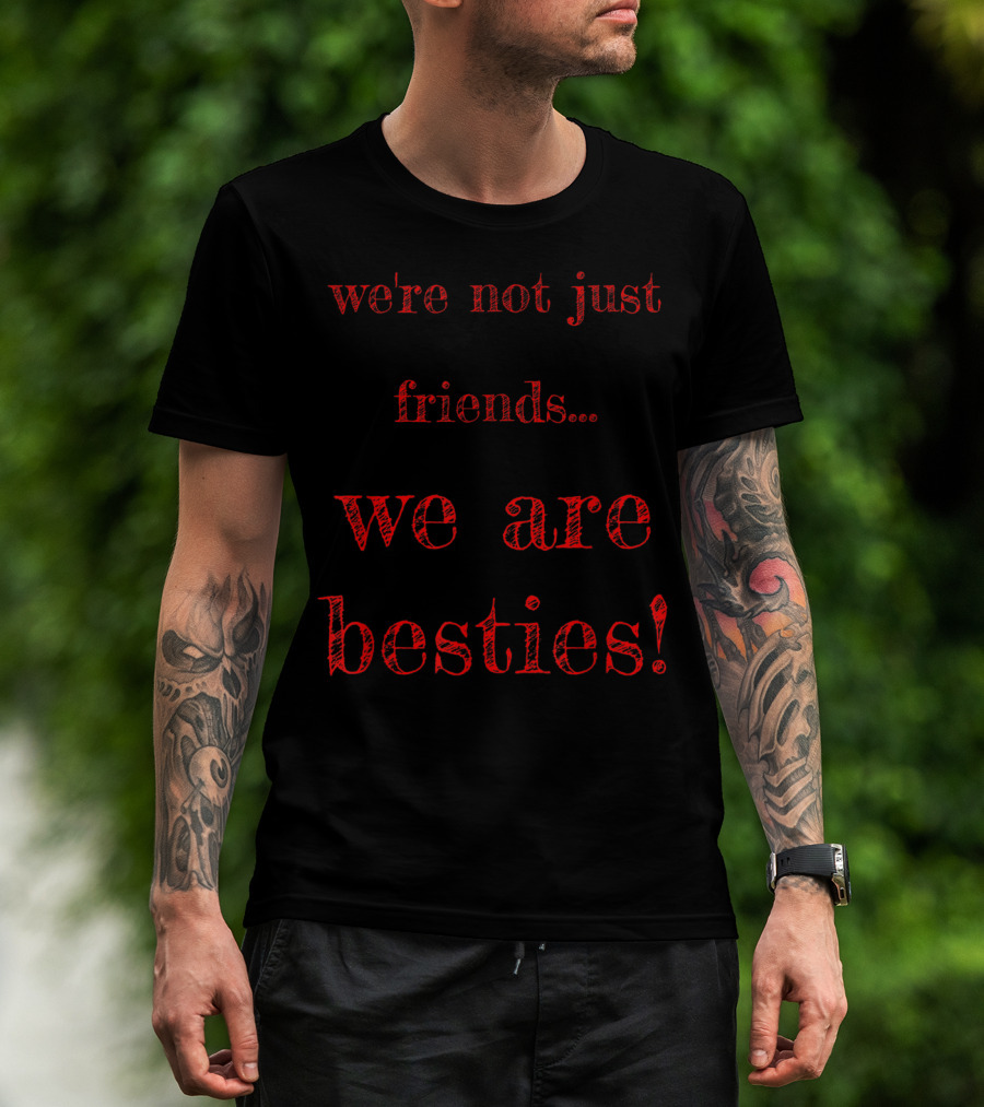 The we're not just friends we are besties T-shirt is designed for everyday wear and a consistent fit. Fabric is pre-shrunk ring-spun cotton with durable stitching. See the size chart below for exact measurements.