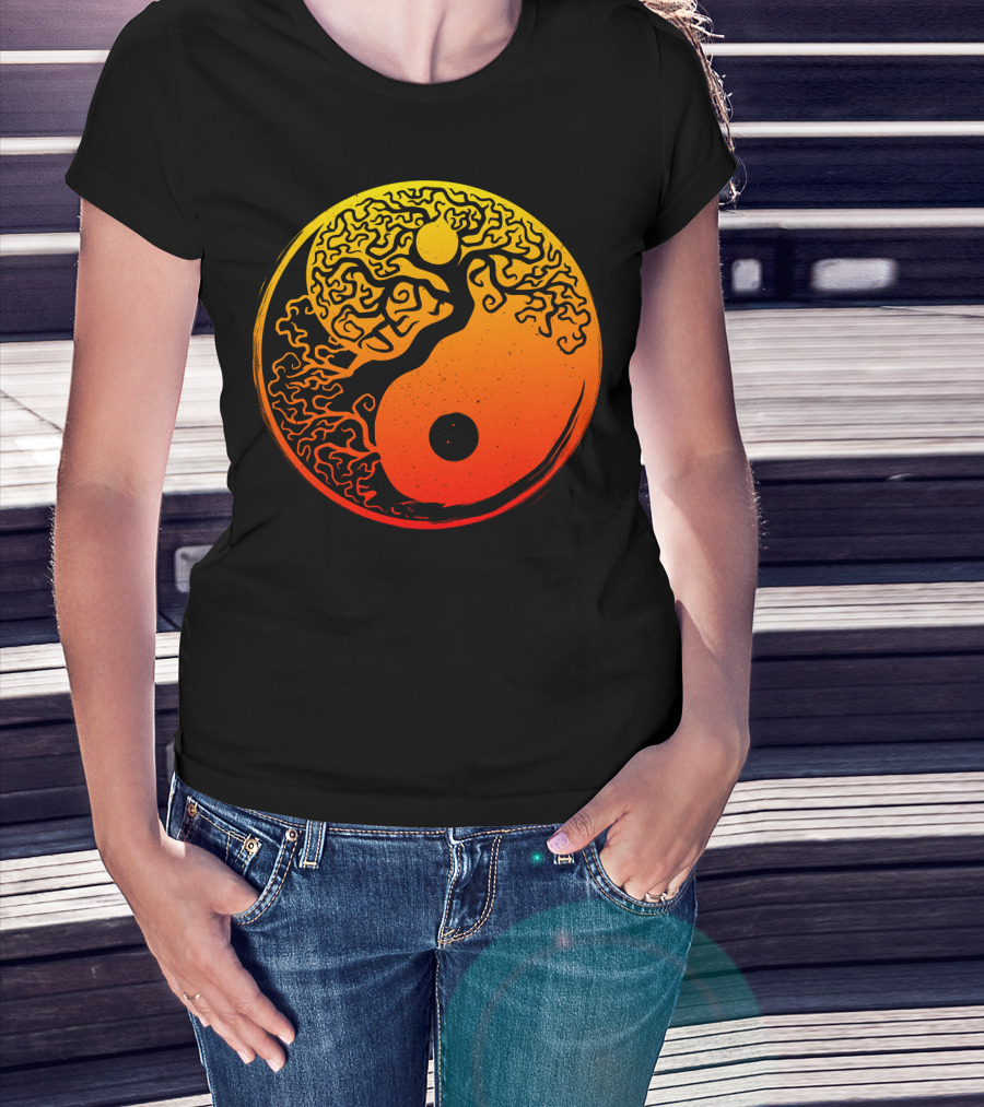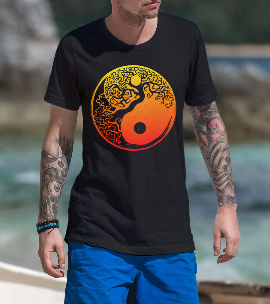 Yin Yang Bonsai Tree Japanese Golden Sun Circle T-Shirt