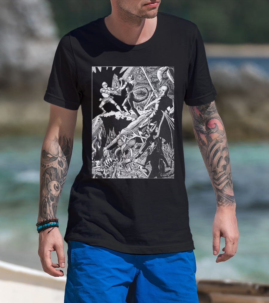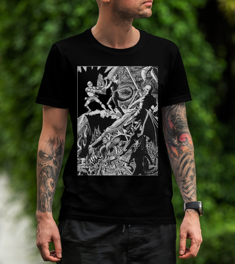 How much will this PALADIN IN HELL Classic Dungeon Adventure Battle Scene with Demons and Warriors shirt shrink?