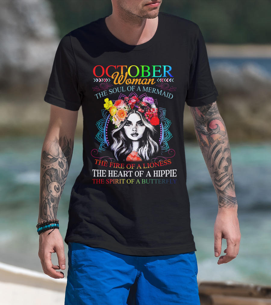 OCTOBER Woman The Soul Of A Mermaid The Fire Of A Lioness The Heart Of A Hippie The Spirit Of A Butterfly T-Shirt