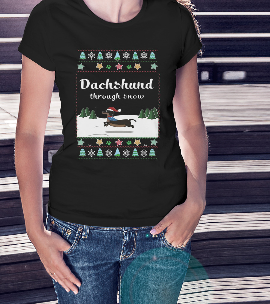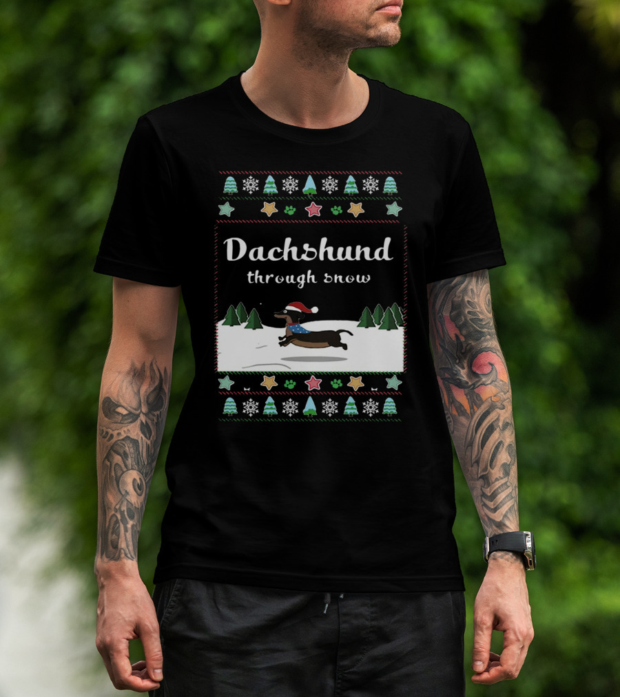 Dachshund Through Snow Christmas Sweater Style With Trees And Stars T-Shirt