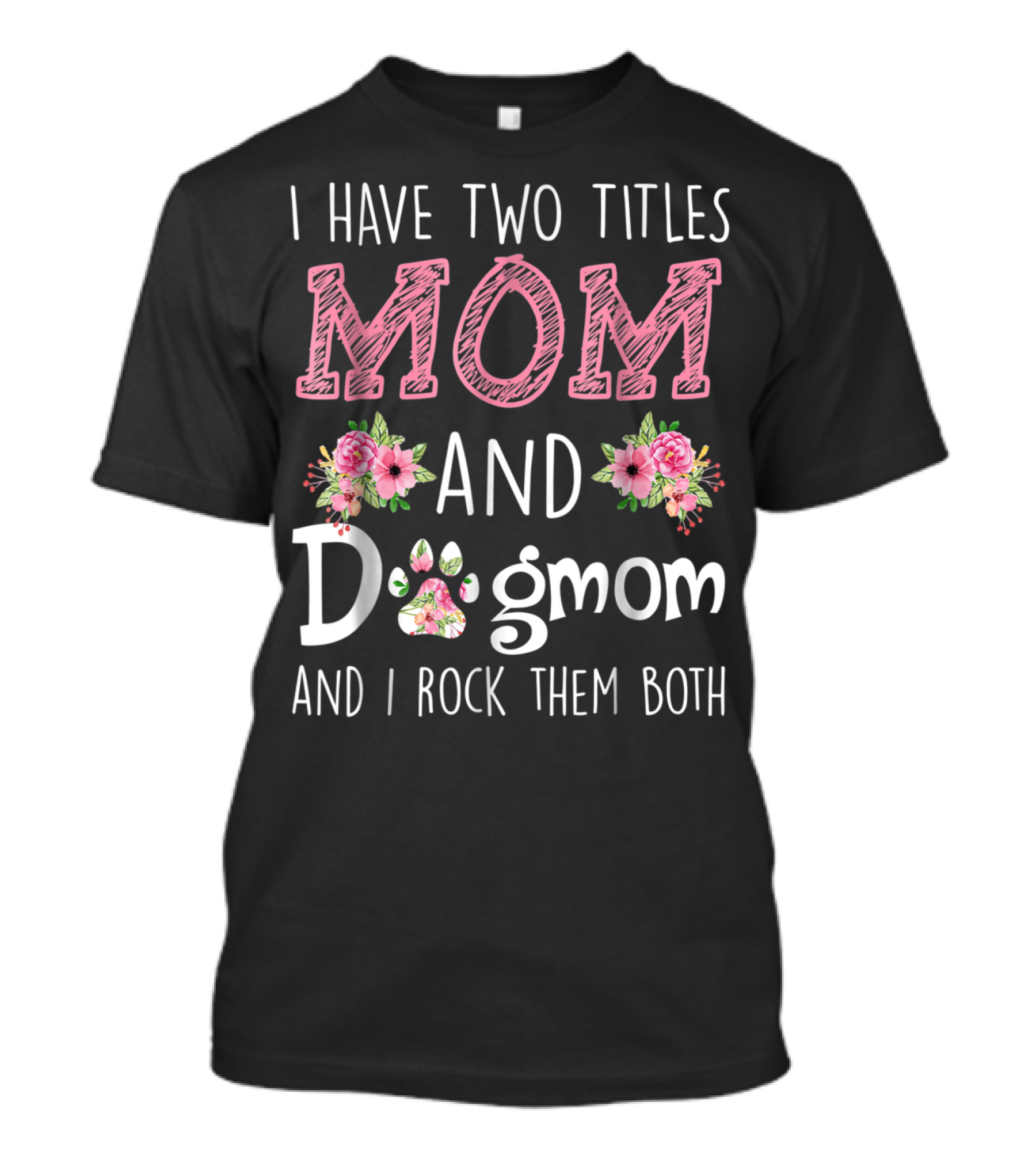 The I Have Two Titles Mom and Dog Mom and I Rock Them Both Floral and Paw Prints T-shirt is designed for everyday wear and a consistent fit. Fabric is pre-shrunk ring-spun cotton with durable stitching. See the size chart below for exact measurements.