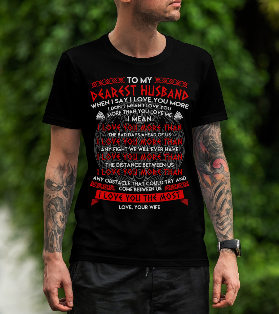 The To My Dearest Husband I Love You More Than The Bad Days The Distance Any Obstacle I Love You The Most Love Your Wife T-shirt is designed for everyday wear and a consistent fit. Fabric is pre-shrunk ring-spun cotton with durable stitching. See the size chart below for exact measurements.