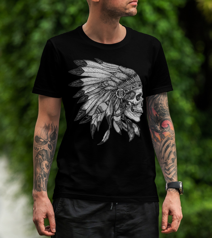 The American Motorcycle Skull with Native Indian Eagle Feather Headdress T-shirt is designed for everyday wear and a consistent fit. Fabric is pre-shrunk ring-spun cotton with durable stitching. See the size chart below for exact measurements.