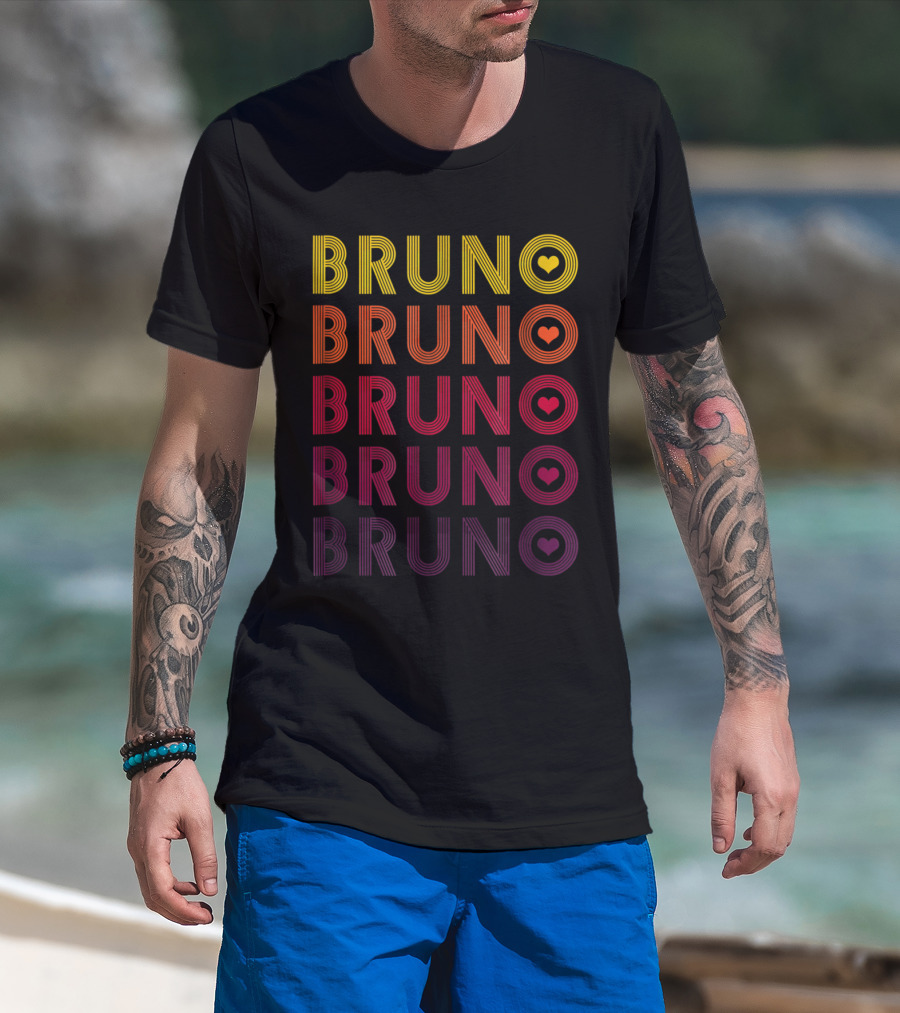 The Bruno Lover Heart Gradient Retro T-shirt is designed for everyday wear and a consistent fit. Fabric is pre-shrunk ring-spun cotton with durable stitching. See the size chart below for exact measurements.