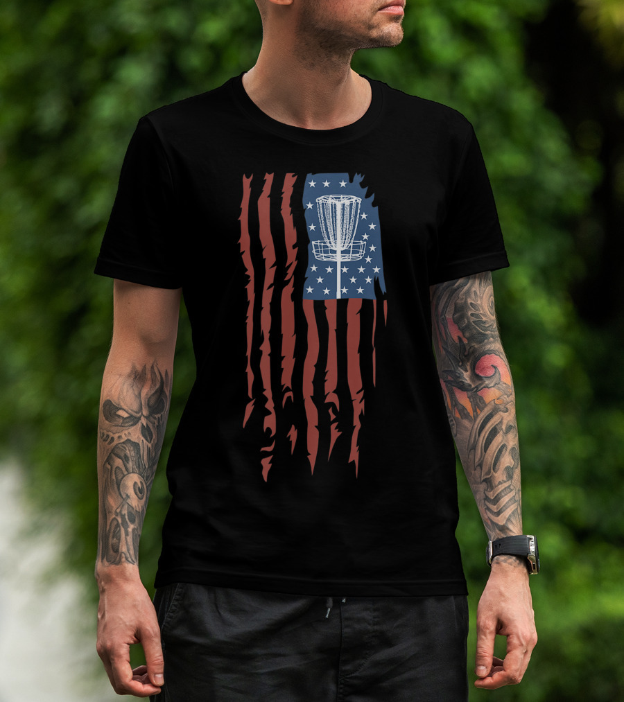 Disc Golf Basket American Flag Frisbee Sports USA T-Shirt