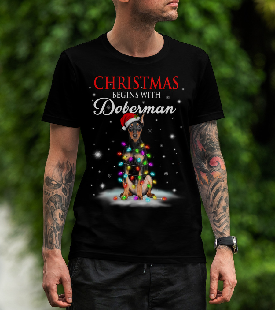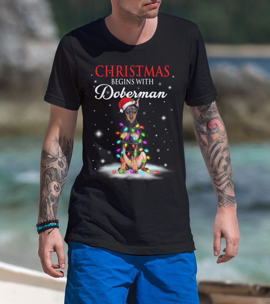 Christmas Begins With Doberman Wrapped In Holiday Lights And Santa Hat Snowflakes T-Shirt