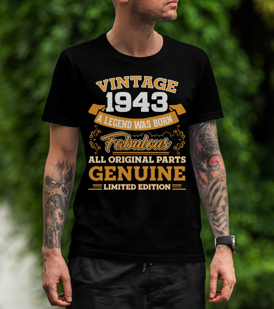The Vintage 1943 A Legend Was Born Fabulous All Original Parts Genuine T-shirt is designed for everyday wear and a consistent fit. Fabric is pre-shrunk ring-spun cotton with durable stitching. See the size chart below for exact measurements.