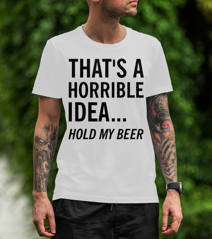 The That's A Horrible Idea Hold My Beer Funny Beer T-shirt is designed for everyday wear and a consistent fit. Fabric is pre-shrunk ring-spun cotton with durable stitching. See the size chart below for exact measurements.