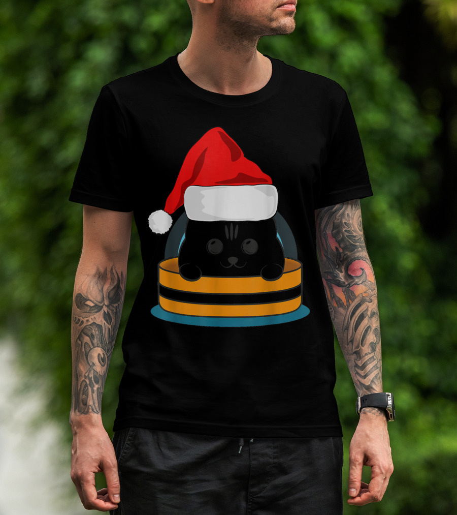 Cute Black Cat In Santa Hat Sitting Inside Orange And Black Barrel T-Shirt