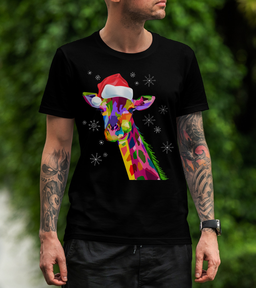 Giraffe Christmas Santa Hat Colorful Snowflakes T-Shirt