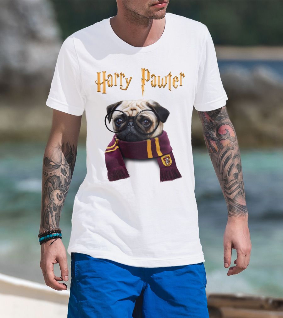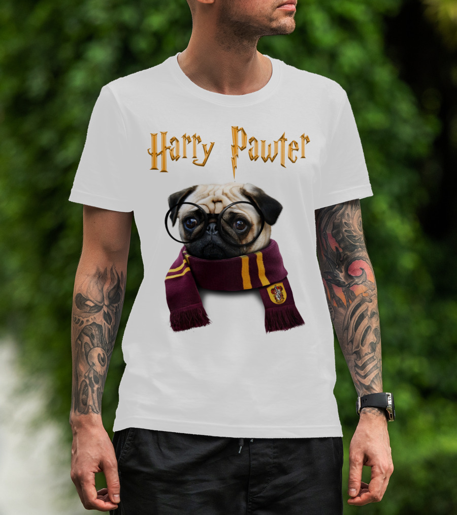 The Harry Pawter Cute Puggy Dogs Potte Pups Wizard Pug With Glasses and Scarf T-shirt is designed for everyday wear and a consistent fit. Fabric is pre-shrunk ring-spun cotton with durable stitching. See the size chart below for exact measurements.