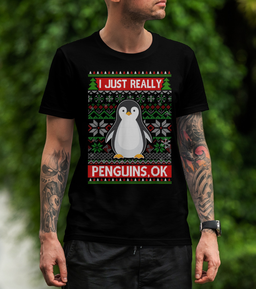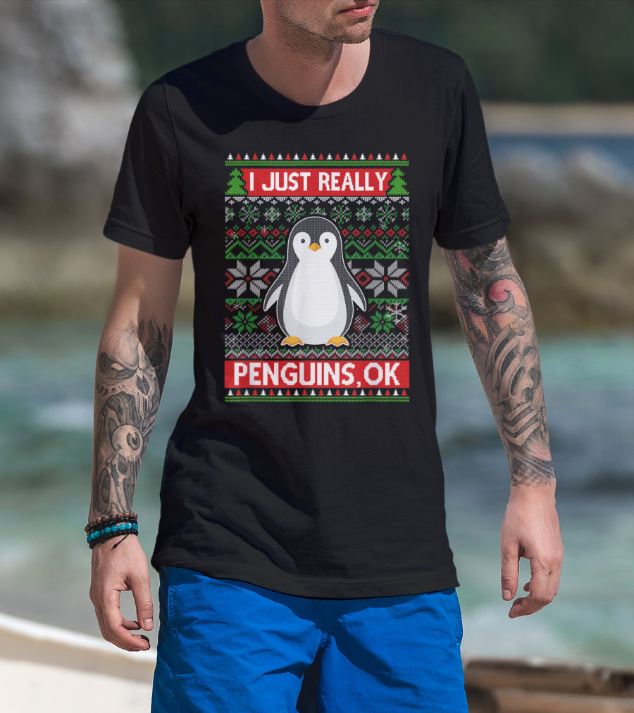 I Just Really Like Penguins, OK Ugly Christmas Sweater Style With Cute Penguin And Festive T-Shirt
