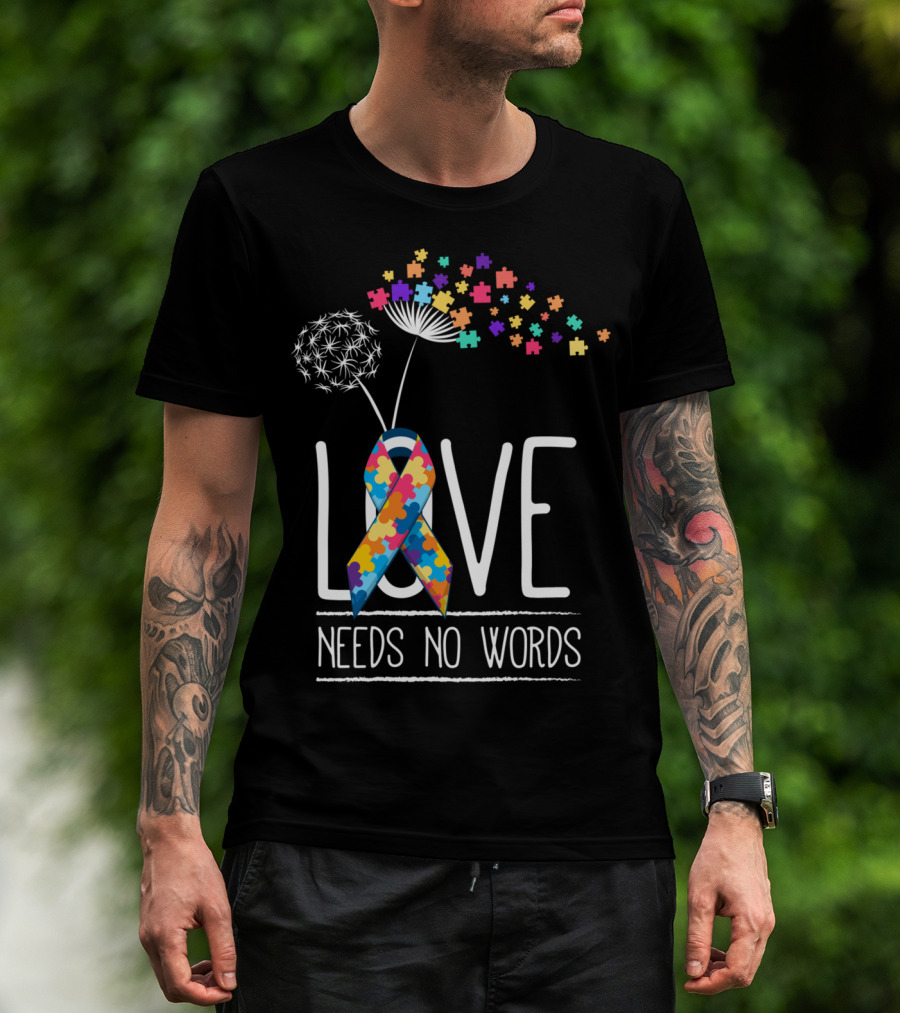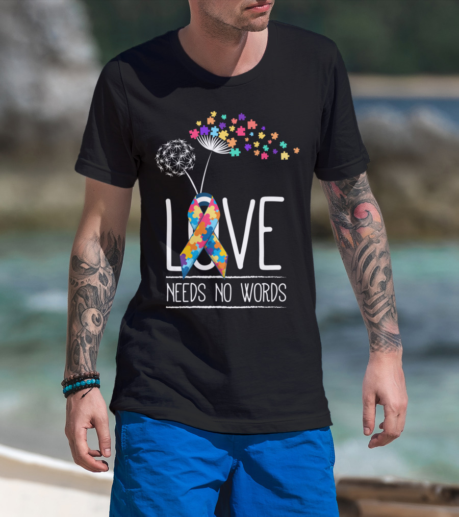 Love Needs No Words Autism Awareness Puzzle Ribbon And Dandelion T-Shirt